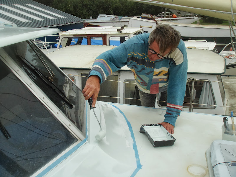 Na de ruiten kwam de schilderbeurt van de opbouw in zicht. We hebben eindeloos geschuurd, geplamuurd, geschuurd, gegrond, weer eindeloos geschuurd, geplamuurd en geschuurd. Tenslotte was Noud aan de beurt om het geheel te lakken. Eerst twee kleurlagen, dan twee transparante lagen. Tussen de twee transparante lagen mogen we uitblazen. De verf moet nu uitharden om nog een keer heel nauwkeurig geschuurd te worden met fijn papier. Dan komt nog de toplaag. Na de eerste laag kleurlak had Noud pech. Hij heeft vanwege wat motregen te lang moeten wachten voor hij kon beginnen. Daardoor was hij te laat in de middag klaar. Het resultaat was al prachtig. Hij had nog getwijfeld aan zijn vaste schildershand, die hij vroeger altijd had, maar na en eerste kwartiertje schilderen concludeerde hij opgelucht: “ik kan het nog!” Maar ’s avonds laat keek ik nog een keer naar de glimmende lak, die intussen helemaal dof geworden was omdat de dauw erin geslagen was. Dat betekende eerst weer schuren, terwijl dat niet op het program stond. Toch kon hij de volgende dag op tijd beginnen, zodat tegen de avond – de dauw dus – de verf al ver genoeg is uitgehard. De dag erna komt de eerste transparante laag dus aan de beurt. Ook die is mooi op tijd klaar. Intussen heb ik in de schilderdagen van Noud het onderwaterschip maar weer geschuurd – met stofafzuiger – zodat we die binnenkort van een nieuwe – zwarte – laag epoxycoating kunnen voorzien. We vertrekken naar Arnhem, om met Toos een aantal stofvrije en verfstankvrije dagen door te brengen. Het is inmiddels erg warm geworden, net op tijd om de twee-componentenverf goed te laten uitharden.