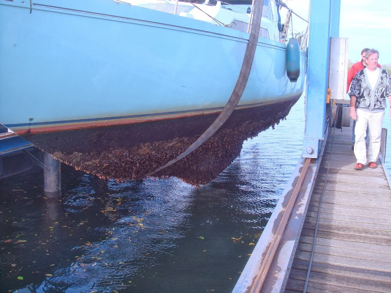 De mosselman, of liever, de mosselmannen wonen niet in Scheveningen. Ze wonen binnenkort een poosje op Madeira. Vandaag is onze Noord-Europese woonplaats uit het water gekomen. Het was al zeven jaar geleden dat dat voor het laatst was gebeurd, en we hebben nu ook al anderhalf jaar niet meer gevaren, en daarvoor ook een lange tijd niet of nauwelijks. Dat was te zien. Ons ‘Seal-Skin’ aangroeiwerende systeem, dat er in 1999 op gezet was, is nu duidelijk uitgewerkt. Hele kolonies zoeetwatermosselen hadden zich een woonplaats verschaft. Dus volgend voorjaar moeten we stevig aan het werk aan de romp. Maar nu staan we op de wal, hoog en droog, en dat is een hele rust als we niet in de buurt zijn. De mosselen zijn van het schip afgespoten, we zijn geen mosselman meer en nu kan Heerenleed een winter lang drogen.